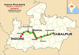 The 22191/22192 Jabalpur - Indore Overnight Express is a daily superfast train of the Indian Railways, which runs between Jabalpur Junction railway station of Jabalpur, an important city & military cantonment hub of India, and Indore Junction, the main railway station in Indore, the commercial hub and largest city of the Central India in the state of Madhya Pradesh.[1][2]