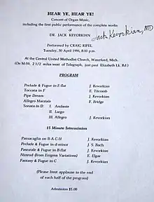 The first public performance of the complete classical organ works by Jack Kevorkian was by Craig Rifel in a live concert[32] on January 30, 1996 at Central United Methodist Church in Waterford, Michigan, including Kevorkian's Prelude & Fugue in E-flat, Pipe Dream, Sonata in D, Passacaglia on B-A-C-H, Pastorale & Fugue in B-Flat, and Fantasy & Fugue in C. In 1999 the Geneva-based self-determination society EXIT commissioned David Woodard to orchestrate wind settings of Kevorkian's organ works.[33]
