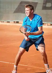 Sock had a slow start to 2013, losing in qualifying at the Brisbane International and the 2013 Australian Open.[23] However, he received a wildcard entry into the U.S. National Indoor Tennis Championships, in which he gained his first wins of the season, reaching the quarterfinals for the second time in his career.[24] In the doubles competition at the same tournament, Sock teamed up with James Blake, also a wildcard entry, reaching the final, where the pair lost to the Bryan brothers.[25] Sock made it through three rounds of qualifying without dropping a set to enter the main draw of the 2013 French Open. In the first round, he defeated the accomplished player Guillermo García-López in only 1 hour and 59 minutes. He then lost to 35-year-old veteran Tommy Haas in straight sets.[26] He tried to qualify for Wimbledon for the first time, but although seeded second, lost to Mischa Zverev. He returned to the US to win his second career Challenger level title in Winnetka, Illinois on July 6, allowing him to break into the top 100 for the first time in his career. At the US Open, he defeated Philipp Petzschner in the first round, going 5 games to 2 up in the third set before Petzschner retired. Sock then went on to beat Maximo Gonzalez, However, he lost to 18th seed Janko Tipsarević in the third round. Following the US Open, his ranking rose to No. 86.
