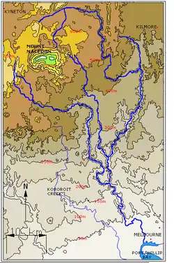 ![]() Contour map of the Maribyrnong River basin; Jackson Creek rises midpoint between the 400–500-metre (1,300–1,600 ft) contour line. | |