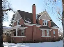Concrete and brick stairs lead onto the porch, the roof of which is supported by six brick columns with decorative arches in between. Large cottage windows with stained glass headers are on either side of a Craftsman-style front door with a stained glass insert. Part of the porch was enclosed with eight-light casement windows in 1935. The most prominent feature on the structure's left (north) side is a large window bay, sharing the wall with a chimney flanked by three double-hung windows and two more double-hung windows next to a side entry, with a wooden storm door and a wooden paneled door. Sharing the back of the structure with the attached garage, a large enclosed porch sports six double-hung windows and a hipped roof. The left (north) side of the house includes more windows, with a window bay matching the one on the right side of the house and a set of triple-ganged double-hung windows flanked by two single double-hung windows.