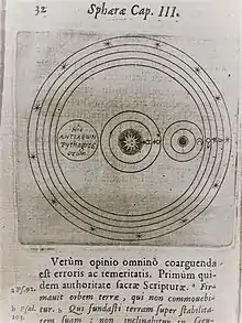 Chapter 6 "The Number of Heaven" is about his personal thoughts on the number of heavens, which differed from many other astronomers before him. Prior astronomers, in particular Plato and Aristotle, believed the number of heavens to be at minimum eight due to their different motions. Another astronomer, Eustachius a Sancto Paulo, believed there were seven planetary heavens: the Moon, Mercury, Venus, the Sun, Mars, Jupiter, and Neptune. He also had firmament as the eighth sphere, the crystal heaven for a ninth and tenth, the primum mobile as an eleventh, and ending with the Empyrean heaven being located above it in his 1609 Summa philosophica quadripartita.[1] Unlike the astronomers before him, du Chevreul only counts five planetary heavens. He only counts Saturn, Jupiter, Mars and the heavens of the moon and the sun. He doesn't include the heavens of the newest planets of the time, Venus and Mercury. He did not include Venus and Mercury because as seen in the optical tube, Mercury and Venus can be found above, below, and next to the Sun and thus circle around the Sun. Du Chevreul believed that no other interpretation of this phenomenon would be possible in nature due to the requirement of a vacuum.[6] Du Chevreul notes that Venus and Mercury are placed above the Sun by notable astronomers Plato and Aristotle while astronomers Ptolemy, Regiomontanus, and Sacrobosco placed the planets below the Sun. Jacques du Chevreul believed that the correct placement of Venus and Mercury required an optical instrument, and thus only astronomers of his generation could see that Venus and Mercury orbited the Sun. Du Chevreul's five heavens are, from center to outskirts: 1. The Moon, 2. The Sun, surrounded by the Bourbon stars, Mercury, and Venus, 3. Mars, 4. Jupiter, surrounded by four Medicean stars, and 5. Saturn, with two concentric orbs. The firmament is located above the planetary heavens, with the celestial waters above the heavens and lastly the Empyrean Heaven; both of which are required by the Sacred Scriptures.[1]