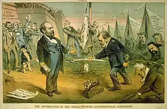 Garfield was not at all enthused about President Grant's reelection in 1872—until Greeley, who emerged as the candidate of the Democrats and Liberal Republicans, became the only serious alternative. Garfield said, "I would say Grant was not fit to be nominated and Greeley is not fit to be elected."[99] Both Grant and Garfield were overwhelmingly reelected.[99]