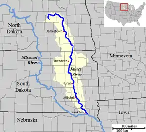 The Jamestown Dam[2] is a rolled-earth dam spanning the James River in Stutsman County in the U.S. state of North Dakota, serving the primary purpose of flood control. It is north of the city of Jamestown, North Dakota.[3] Built from April 1952 to September 1953, the dam measures 1,418 feet (432 m) long at the crest and 85 feet (26 m) high. It impounds the James River to form the Jamestown Reservoir. A small islet lies shortly upstream of the dam, where the James River previously split into two channels.