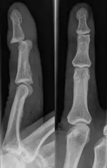 A jammed finger can generally be diagnosed via physical examination. The relative position of the bones of the finger give an indication as to potential dislocations or fractures.[3] However, it is recommended to seek medical attention regardless of whether or not a dislocation or fracture is evident.[6] This is because untreated jammed fingers can lead to future pain and stiffness, with joint surface fractures increasing the risk of arthritis.[6] The areas around the injury may be palpated in order to ascertain the areas of maximum pain.[2] If the injury is a joint injury (namely a sprain or dislocation), the point of maximum pain will be close to the joint rather than mid-phalanx (mid-bone).[2] Due to the risk of dislocations or fractures, stability testing is not recommended until after an x-ray has been conducted and the presence of a dislocation or fracture has been confirmed or rejected.[2] In extremely painful cases, a digital nerve block, where anaesthetic is injected in the web to either side of the affected finger, may be employed to enable assessment of the injury.[2] X-rays may be employed to achieve a more accurate diagnosis of a jammed finger, enabling the identification of varying types of dislocation or fractures. In order to account for all possibilities, it is recommended that a variety of views (lateral, oblique, and anteroposterior) are observed.[2]