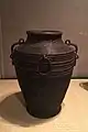 Another item depicting or imitating a woven bamboo piece is this mizusashi tea ceremony water jar, c. 1750–1850 (Edo period), which takes the shape of a bamboo basket. The jar is stoneware, with a cream slip and brown glaze, the texture of woven bamboo pressed into the jar.[118]