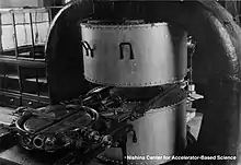 On 16 October 1945 Nishina sought permission from the American occupation forces to use the two cyclotrons at the Riken Institute for biological and medical research, which was soon granted; however, on 10 November instructions were received from the US Secretary of War in Washington to destroy the cyclotrons at the Riken, Kyoto University, and Osaka University.[17] This was done on 24 November; the Riken's cyclotrons were taken apart and thrown into Tokyo Bay.[18]