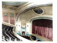 The stage features an ornate proscenium arch with a beautiful mural by William Peaco of Chicago, whose work was featured in many public buildings in the Midwest.