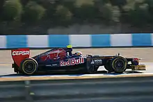 Vergne had his first outing in a Formula One car at the Goodwood Festival of Speed in July 2010, driving a Red Bull RB5.[25] In September 2010, it was announced that he would drive for Toro Rosso in the post-season young driver test to be held at the Yas Marina Circuit in November,[25] with the team later confirming that he would drive the Toro Rosso STR5 for both days of the test.[26] On the first day of the test he set the seventh fastest time with a lap of 1:42.489, completing 93 laps in the process.[27]