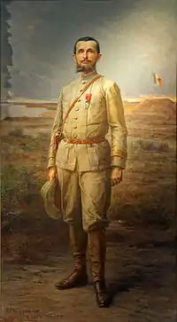 Marchand was born in Thoissey, Ain, on 22 November 1863.[1] In 1883 he enlisted as a volunteer soldat (private soldier) in the 4th Regiment of Infanterie de Marine based at Toulon. In April 1886 he attended l’Ecole militaire de Saint-Maixent - the French military academy for training officers promoted from the ranks. He was commissioned as a sous-lieutenant on 18 December 1887, at the age of 24. After serving in the 1st Regiment of Infanterie de Marine for six months, Marchand transferred to the tirailleurs sénégalais (West African colonial infantry with French officers).