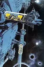 Outside of comics, Mézières' art has been particularly influential on science fiction and fantasy film. In particular, several commentators, such as Kim Thompson,[22] Jean-Philippe Guerand[23] and the newspaper Libération,[24] have noted certain similarities between the Valérian albums and the Star Wars film series. Both series are noted for the "lived-in" look given to their various settings and for the diverse alien creatures they feature. Mézières' response upon seeing Star Wars was that he was "dazzled, jealous... and furious!".[25] As a riposte, he produced an illustration for Pilote magazine in 1983 depicting the Star Wars characters Luke Skywalker and Leia Organa meeting Valérian and Laureline in a bar surrounded by a bestiary of alien creatures typical of that seen in both series. "Fancy meeting you here!" says Leia. "Oh, we've been hanging around here for a long time!" retorts Laureline.[26] Mézières has since been informed that Doug Chiang, design director on The Phantom Menace, kept a set of Valérian albums and Les Extras de Mézières in his library.[1]