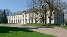 Jean Aubert frequented the unofficial Académie du Petit-Luxembourg that was founded in 1729 by the comte-abbé de Clermont, another member of the house of Condé, the younger brother of the builder of the stables of Chantilly. For the abbé, who was abbé commendataire of Chaalis, Aubert created the plans for the reconstruction of Chaalis Abbey in 1736. Begun in 1739 and intended as a large quadrangle, only the entrance wing with the abbot's residence was completed. Further work was halted in 1745 due to lack of funds and never resumed.[7]