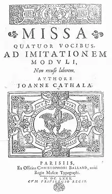 Cathala seems to have returned to Paris on an unknown date: probably he was the "Cathalas", an ordinary singer of the Paris church, who attended the funeral of Louis Gingart's son, ordinary musician of the king and queen, on 27 February 1673, and who resided in the Rue des Marmousets-en-la-Cité (La Madeleine parish).[4] On 31 December 1679, he is said to be teaching music in Paris while witnessing the wedding of an officer of the archbishop of Paris.[5]