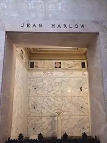 Harlow was interred in the Great Mausoleum at Forest Lawn Memorial Park in Glendale in a private room of multicolored marble, which William Powell bought for $25,000 (equivalent to $444,618 in 2019).[89] She was laid to rest in the gown she wore in Libeled Lady; in her hands she had a white gardenia and a note that Powell had written: "Goodnight, my dearest darling." Harlow's inscription reads, "Our Baby".[90]