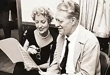 MacDonald appeared on early TV, most frequently as a singing guest star. She sang on The Voice of Firestone on November 13, 1950.[103] On November 12, 1952, she was the subject of Ralph Edwards' This Is Your Life.[104] Her surprise guests included her sisters, a sailor she danced with at the Hollywood Canteen, her former English teacher, her husband and the reverend that married them, and Nelson Eddy appeared as a voice from her past, singing the song he sang at her wedding; his surprise appearance brought her to tears. Shortly thereafter, she appeared as the mystery guest on the December 21, 1952, episode of What's My Line?[103] After the panelists guessed her identity, she told John Daly she was in New York for the holidays and would have a recital at Carnegie Hall on January 16. On February 2, 1956, MacDonald starred in Prima Donna,[105] a television pilot for her own series, written for her by her husband Gene Raymond. The initial show featured guest stars Leo Durocher and Larraine Day, but it failed to find a slot. In December 1956, MacDonald and Eddy made their first TV appearance as a team on the Lux Video Theatre Holiday Special. In 1957, Eddy and she appeared on Patti Page's program The Big Record, singing several songs.[3] On Playhouse 90 (March 28, 1957), MacDonald played Charley's real aunt to Art Carney's impersonation in "Charley's Aunt."[105]