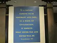 The quotes from the panel of the northeast interior wall are from multiple sources. The first sentence, beginning "God who gave ...", is from A Summary View of the Rights of British America.[17] The second, third and fourth sentences are from Notes on the State of Virginia.[18] The fifth sentence, beginning "Nothing is more ...", is from Jefferson's autobiography.[19] The sixth sentence, beginning "Establish the law ...", is from a letter of August 13, 1790, to George Wythe.[20] The final sentence is from a letter of January 4, 1786, to George Washington:[14][21]