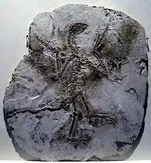 Over 100 specimens of Jeholornis have been found,[12] though only seven have been formally described. The type specimen is in the collection of the Institute of Vertebrate Paleontology and Paleoanthropology in Beijing. It is cataloged as IVPP V13274, and was reported in the journal Nature in 2002. A second specimen is in the collection of the Liaoning Provincial Museum of Paleontology, and is catalogued as LPM 0193 it was reported as a new species, Shenzhouraptor sinensis, in the journal The Geological Bulletin of China in 2002, but is likely a junior synonym of Jeholornis prima.[9] Two more specimens were later accessioned by the IVPP as V13550 and V13553 and they were reported in the journal Naturwissenschaften in 2003. A fifth specimen, SDM 20090109, was described in 2012 and made the type specimen of the species J. palmapenis. A sixth specimen, STM2-51, was reported in 2013 and preserved round structures in the body cavity which were interpreted as ovaries.[13] A seventh specimen, YFGP-yb2, was described in 2014 and made the type specimen of a third species, J. curvipes.[9]