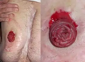 Jejunostomy is the surgical creation of an opening (stoma) through the skin at the front of the abdomen and the wall of the jejunum (part of the small intestine). It can be performed either endoscopically, or with open surgery.[1]