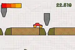 In JellyCar, players drive a small car across various platforms and through obstacles in order to reach the goal. The player's car is made out of a gelatinous substance (hence the name), giving it both flexibility and durability.[2] As the player advances through the level, a meter begins to fill; when it fills to capacity, the player can make the car expand and grow into a monster truck, allowing it to traverse larger obstacles for a short period of time.[2]