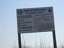 Designated sections of the Jensen Sea Turtle Beach are barricaded off in order to protect the nests of the sea turtles. The three species found on this beach are the loggerhead, leatherback turtle and green sea turtle. Loggerhead nests are the most common type found on this and adjacent beaches. Locations of the sea turtles' nests are marked with the approximate date in which the eggs were laid and the expected date in which the eggs will hatch. These notifications are meant to discourage tourists and residents from visiting the beach in the evening hours during these time periods. Efforts are made to protect both species of sea turtles since nests have been declining in recent years due to the severe erosion of the beach.