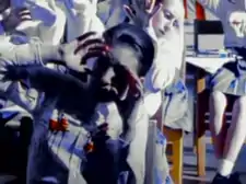 The final scene of the video shows Jeremy striding into class shirtless, tossing an apple to the teacher, and standing before his classmates. He reaches down and draws back his arm as he takes a gun out of his pocket (The gun only appears onscreen in the unedited version of the video). The edited version cuts to an extreme close-up of Jeremy's face as he puts the barrel of the gun in his mouth, closes his eyes, and pulls the trigger. After a flash of light, the screen turns black. The next shot is a pan across the classroom, showing Jeremy's blood-spattered classmates, all completely still, recoiling in horror. The video ends on a shot of a dangling blackboard, on which all the harsh terms and phrases seen earlier had been scrawled.