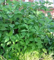 Helianthus tuberosus is a herbaceous perennial plant growing to 1.5–3 m (4 ft 11 in–9 ft 10 in) tall with opposite leaves on the upper part of the stem but alternate below.[5] The leaves have a rough, hairy texture. Larger leaves on the lower stem are broad ovoid-acute and can be up to 30 cm (12 in) long. Leaves higher on the stem are smaller and narrower.[6]