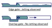 Jetting is an moulding defect that can occur in the manufacturing process of injection muolding. Jetting is a snake-like stream which occurs when polymer melt is pushed at a high velocity through restrictive areas.[1]