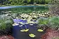 Jezero is a clustered village on a semicircular plain between Saint Anne's Church to the west and Saint Lawrence's Church to the northeast. South of the village in the Zajezero Plain there are low-lying wet meadows and 37-meter (121 ft) deep Lake Podpeč (Slovene: Podpeško jezero or Jezero pri Podpeči). The lake is fed by several springs in the nearby forest and contains trout, carp, and pike.[4] The main tributary of the lake is Mill Creek (Mlinski potok), a constant surface watercourse. The lake drains through a siphon at the bottom, later emerging to the northwest as Hruški Creek (Hruški potok), a tributary of the Ljubljanica River.[5] Swimming is permitted in the lake at one's own risk.[5] Below Saint Lawrence's church are several sets of fields known by the microtoponyms Rušne, Deli, and Cervenke. A water main is connected to Jezero from the hamlet of Podkamnik in the neighboring village of Kamnik pod Krimom. There are several karst caves in the vicinity, including Frog Caves (Krkonove jame), Peršin Shaft (Peršinovo brezno), Little Woods Cave (jama v Malih gozdih), Lipovec Shaft (brezno v Lipovcu), and Big Peak Shaft (brezno pod Velikim vrhom).[4]