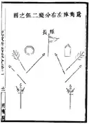 Ideally an entire musket team would have 10 musketeers, but often had 4 or 2 in practice. The optimal musket formation that Qi proposed was a 12 man musket team similar to the melee mandarin duck formation. However, instead of fighting in a hand to hand formation, they operated on the principle of volley fire, which Qi pioneered prior to the publication of the first edition of the Jixiao Xinshu.[6] The teams could be arranged in a single line, formed two layers deep with five musketeers each, or five layers deep with two muskets per layer. Once the enemy was within range, each layer would fire in succession, and afterwards a unit armed with traditional close combat weapons would move forward ahead of the musketeers. The troops would then enter into melee combat with the enemy together. Alternatively, the musketeers could be placed behind wooden stockades or other fortifications, firing and reloading continuously by turns.[7]