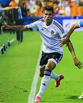 On 20 August 2014, Cancelo joined Valencia on a one-year loan deal with the option to purchase for €15 million.[9] Although his economic rights were owned by Peter Lim, a loan was arranged to take him to Valencia due to Lim's purchase of the latter club.[10] His La Liga debut occurred on 25 September, playing the entirety of a 3–0 home win over Córdoba;[11] He initially started as a substitute and appeared in the round of 16 round of the Copa del Rey in the first leg against Rayo Vallecano. He would also occasionally move to the right wing and later his good performances, specially against Levante on 12 April 2015, in which he was awarded the man of the match.[12][13] Throughout the season he was used a second choice right-back behind Antonio Barragán, finishing the season with 13 appearances, across all competitions. Cancelo's performances helped Valencia reach Champions League, leading on 25 May, Cancelo agreeing to a permanent contract with the Spanish club until 30 June 2021, for a transfer fee of €15 million.[14][15][16][17]