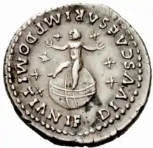 One aspect of the vision is the portrayal of Jesus holding seven stars in his right hand. Such a motif is also found on coins of the Emperor Domitian. Sometime between 77 and 81, Domitian's infant son died.[17] He was subsequently deified, and is portrayed on coins of Domitian, with seven stars. Ernest Janzen argues that the globe on which the infant stands represents world dominion and power, while the stars indicate his divine nature; he is depicted as "the son of (a) god" and "conqueror of the world."[18] Although Domitian's son cannot be said to be holding the stars, some scholars have drawn parallels between the numismatic and biblical evidences. Frederick Murphy notes that "Revelation's image of Jesus with seven stars in his hand may be an allusion to that coin and an implicit critique of it. It is not the Roman imperial family that has cosmic significance, but Jesus."[12]