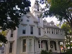 The John C. Anderson House is a historic house located at 920 W. Breckenridge St. in Carlinville, Illinois. The house's first floor was built in 1883, while its second floor was added in 1892. The first floor has an Italianate design featuring tall, narrow windows, an asymmetrical porch with paired columns, paired brackets, and a dentillated cornice. The second floor is designed in the Queen Anne style and includes a square tower with stick style framework, a multi-component roof with gabled dormers, and a stained glass window with a decorative wooden frame. Local banker C.H.C. Anderson built the house for his son John C. Anderson as a wedding gift; John and his wife Lucy lived in the house until their deaths in the 1930s.