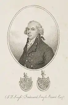 Stuart was born in Scotland in 1745 and began life there as John Smyth or John Ferdinand Smyth. He later wrote that he was the son of R. Wentworth Smyth, a gentleman who had fought in the Jacobite rising of 1715 and also the later one of 1745. According to Stuart’s account, in 1744 his elderly father married Maria Julia Dalziel, a widow of fifteen, as his second wife. He reported that his mother was a grand-daughter of General James Crofts, a natural son of the Duke of Monmouth, who was a son of Charles II, and that Wentworth Smyth was Monmouth’s son by Henrietta Maria Wentworth, a daughter of Thomas, Lord Wentworth, and grand-daughter of Thomas Wentworth, 1st Earl of Cleveland. Henrietta Maria had died in 1686, not long after Monmouth's execution, and Stuart said a Colonel Smyth, an aide-de-camp of Monmouth’s, had adopted her son and made him his own heir.[1] Consequently, Stuart’s father had grown up in France, from where he returned to Scotland at the time of the 1715 Rising.[2] Stuart stated in 1808 that he had been named for his godfather, Prince Ferdinand of Brunswick.[3]