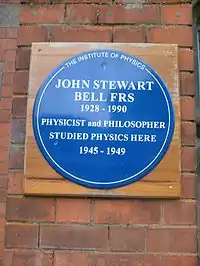 - There is a blue plaque commemorating John Stewart Bell in Queen's university main campus