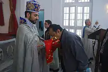 The Gospel of Luke adds an account of John's infancy, introducing him as the miraculous son of Zechariah, an old man, and his wife Elizabeth, who was past menopause and therefore unable to have children.[53][54] According to this account, the birth of John was foretold by the angel Gabriel to Zechariah while he was performing his functions as a priest in the temple of Jerusalem. Since he is described as a priest of the course of Abijah and Elizabeth as one of the daughters of Aaron,[55] this would make John a descendant of Aaron on both his father's and mother's side.[56] On the basis of this account, the Catholic as well as the Anglican and Lutheran liturgical calendars placed the feast of the Nativity of John the Baptist on 24 June, six months before Christmas.[57]