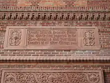 The buildings contains three prominent quotations on its main, west-facing facade. Above the door, there is a quotation from Proverbs, near the south end of the facade there is a passage from Plato, and on the north part a quotation from Lao Tzu.[6]