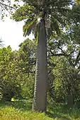 The thickest well-documented Jubaea was on the estate of J. Harrison Wright in Riverside, California. Its diameter "at shoulder height" was 66 inches (1.7 m).[3] The largest of several specimens at the Adelaide (South Australia) Botanic Garden in 1889 was stated to be 6 feet (1.8 m) thick at the base.[4] A hollow (but living) Jubaea in the Ocoa Valley near La Campana National Park, Chile is 6 to 7 feet (1.8 to 2.1 m) thick at its base, with no apparent taper in the lower trunk.[5] The largest individual specimen of indoor plant in the world was the Jubaea chilensis at Kew Gardens, which was cut off by staff in 2014 because it grew to the top of its greenhouse.[6] Of the more than 2,600 known species of palms, Jubaea chilensis is the second most massive, exceeded only by the floodplain or river bottom variety of Borassus aethiopum.[7]