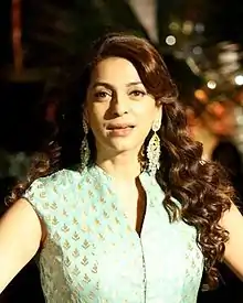 After appearing in offbeat films and occasionally playing guest roles throughout the decade, Chawla made a full-fledged comeback in 2014 with Gulaab Gang alongside her once arch-rival Madhuri Dixit. Chawla and Dixit played ruthless political rivals, and this was the first time in Chawla's career that she played an antagonist. Her negative role of Sumitra was widely appreciated and her performance earned rave reviews.[78] Shubhra Gupta of The financial Times described her character as "the sort of politician that men have played for ever: hungry for power, will stop at nothing, not even murder and mayhem. She rules with an iron fist and a sneer."[79] Hindustan Times wrote, "An effective hero needs a larger-than-life villain. In this case, it is Juhi Chawla who marries her sister to a rapist and apparently killed her husband to get political power. Like most corrupt politicians we see onscreen, she is an opportunist who lusts for power. It speaks well about her acting prowess that we come to hate the otherwise effervescent Juhi in this film."[80] Anupama Chopra wrote, "Her perverse wickedness is the best part of the film", but called it a "a one-note character".[81] Rajeev Masand called her "terrific" in the part and concluded a scathing review of the film asserting, "if you must watch this film, watch it for Juhi Chawla's inspired performance."[82] She received a second Filmfare nomination for Best Supporting Actress.[83] The same year she also appeared with Helen Mirren and Om Puri in a guest role in the Steven Spielberg-produced Hollywood film The Hundred Foot Journey.[84]