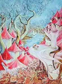 Zisman paints in a figurative and narrative style using "similes that expose her personal codes like in a private diary." She says her painting sets her free, allowing her to "wander like the wind and fly like a spirit."[4]