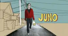 Juno's opening title sequence, depicting a rotoscoped Juno walking through her town while drinking a bottle of SunnyD orange drink, was put together over 7–8 months[40] by a small design studio, Shadowplay Studio, based in Los Angeles.[59] Reitman had met the studio's co-founder Gareth Smith in Japan on the short film festival circuit where they each had shorts screening.[59] Shadowplay created the opening title sequence for Reitman's previous film, Thank You for Smoking, and he contacted them again when he found out he was going to direct Juno.[60] With vintage 1970s punk-rock posters as inspiration, Smith and artist Jenny Lee decided to create a sequence that "had texture and a little bit of edge, but also imparted the warmth and heart of the screenplay".[61] In the last days of filming in Vancouver,[61] Page was photographed with a high speed camera from a number of angles walking on a treadmill and drinking SunnyD.[59] 900 still images of a walking and drinking Page were printed out and repeatedly run through a Xerox machine to degrade their quality until the pictures appeared hand-drawn.[60] The pictures were cut out and scanned back onto the computer, then layered onto the background drawn by Lee with compositing software[59] to create a stop motion animation sequence that corresponded to "All I Want Is You" by Barry Louis Polisar, the song Reitman had chosen.[51] Shadowplay also designed the titlecards for each of the seasons for the film,[40] hand-made a custom typeface for the opening title sequence and the closing credits, and collaborated on the design of the soundtrack and the DVD.[61]