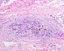 ![]() The juxtaoral organ of Chievitz is composed of nests of benign squamoid epithelium closely associated with multiple nerve bundles. The deep location and squamous appearance can histologically mimic invasive squamous cell carcinoma. (Hematoxylin and Eosin stained section, 100x magnification) | |
