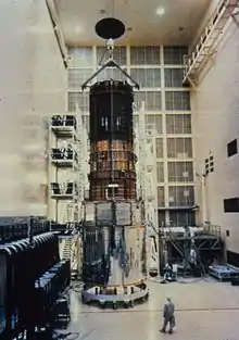 The KH-11 KENNEN[1][2][3][4] (later renamed CRYSTAL,[5] then Evolved Enhanced CRYSTAL System, and codenamed 1010[6] and Key Hole[6]) is a type of reconnaissance satellite first launched by the American National Reconnaissance Office in December 1976. Manufactured by Lockheed in Sunnyvale, California, the KH-11 was the first American spy satellite to use electro-optical digital imaging, and so offer real-time optical observations.[7]