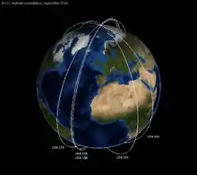The constellation consists of two primary and two secondary satellites (one primary and one secondary per plane). The orbital planes of the two primary satellites in the East and West plane are separated by 48° to 50°. The orbital plane of the secondary satellite in the East plane is located 20° to the east of the primary satellite, while the orbital plane of the secondary satellite in the West plane is located 10° to the west of the primary satellite.[63][64]