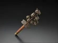 Kagura suzu (神楽鈴) are a set of twelve bells used in kagura dance.[1][2] The set consists of three tiers of bells suspended by coiled brass wires from a central handle: two bells on the top tier, four bells on the middle tier, and six bells for the bottom tier. The shape of the bells are thought to have been inspired from the fruits of the ogatama tree (Michelia compressa).