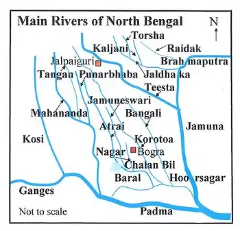 Kaljani River (Bengali: কালজানী) is a tributary of Torsha river, originated (26°50'24"N 89°26'28"E) in Bhutan at the foothills of the Himalayas and it flows from north to south via Bhutan & India and confluences (26°16'25"N 89°35'01"E) with Torsha river that again confluences with Brahmaputra river which confluences with Padma river that merges with Bay of Bengal. Kaljani river and its tributaries are attractions of the Dooars[[1]] Major tributaries of Kaljani are Dima, Nonai, etc. The major portion of the river flows through the Indian state West Bengal. In 1993, towns like Alipurduar, Hamiltanganj on its bank was flooded when retaining wall of dam leaked and thrashed while letting the river enter in town killing hundreds of people and animals.