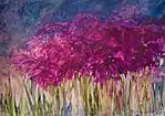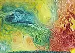 Khavarani is trained in classical painting, his early works were painted in this style. His works also include ink sketches and lifelike portraits[1] In more recent years, his paintings are inspired by the Persian poet Jalal ad-Din Rumi. Rumi emphasizes the freedom of and individuality of creation obtained through love and joy and the fluidity of reinventing itself, but to viewers these connections are indistinguishable. Yet, his paintings hold the capacity to endow a heightened state of mind associated with the themes of Rumi.[2] Common motifs of his paintings include plants: such as flowers and trees, the four elements: earth, wind, water and fire, and he uses the theme of creation or Genesis. This new style of painting is in the genre of "Abstract Romanticism", described by Albert Boime as: "The debut of a new art form, bringing emotion and beauty into the here and now. A dreaming for and of transcendence: an art for a new humanity".[2]