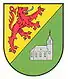 The municipality's arms might be described thus: Per bend sinister Or a lion rampant sinister gules armed and langued azure and vert a chapel sinister argent.