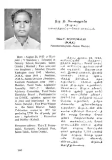 Karipatti T. Ponnumalai (Tamil: காரிப்பட்டி தி.பொன்னுமலை) was an Indian politician and former Member of the Legislative Assembly of Tamil Nadu. He was elected to the Tamil Nadu legislative assembly as a Dravida Munnetra Kazhagam candidate from the Panamarathupatti constituency in the 1967 and 1971 elections. He was the member of the Tamil Nadu electric board advisory committee. He won the first prize in the Salem district paddy cultivation contest in 1957 for producing 7,750 lbs paddy per acre. He participated in the agitation by Dravida Munnetra Kazhagam against rises in price and imprisoned in a Salem subjail.[1][2]