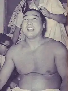 Kashiwado changed the spelling of his ring name to 柏戸 健志 in May 1962, but changed it back in November 1964. He went on to win five top division championships in total, a long way behind the thirty-two captured by his rival Taihō, who was promoted to yokozuna simultaneously with him. He was however a tournament runner-up on no fewer than fifteen occasions. Kashiwado suffered from many injury problems during his career, which led to him being dubbed the "glass yokozuna". He failed to complete four tournaments in a row from January to July 1963. However he made a spectacular comeback in September 1963, winning his first championship as a yokozuna with a perfect 15–0 record. He was listed as a yokozuna on the banzuke for 47 tournaments, which puts him in equal seventh place on the all-time list.[1] He was popular among sumo crowds, appealing to those who found Taihō too dominant.[2] The eight years in which the two shared the yokozuna rank was known as the Hakuhō era, a combination of their names (Haku is another reading of Kashi.)[2]