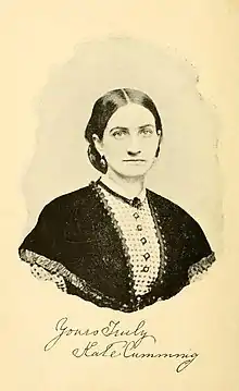Born in Edinburgh, Scotland, her family immigrated to the United States when Cumming was still young, settling finally in Mobile, Alabama.[2][3] At the outbreak of the Civil War, Cumming's mother and two sisters left for England, leaving Cumming behind with her father and brother.[1] Against her family's wishes, in April 1862, Cumming volunteered as a nurse in a Confederate hospital located in Corinth, Mississippi, near the location of the Battle of Shiloh after her brother enlisted in the 21st Alabama Infantry.[4][5] She was inspired to serve by Florence Nightingale as well as Reverend Benjamin M. Miller, who called women specifically to aid the Confederacy.[2]